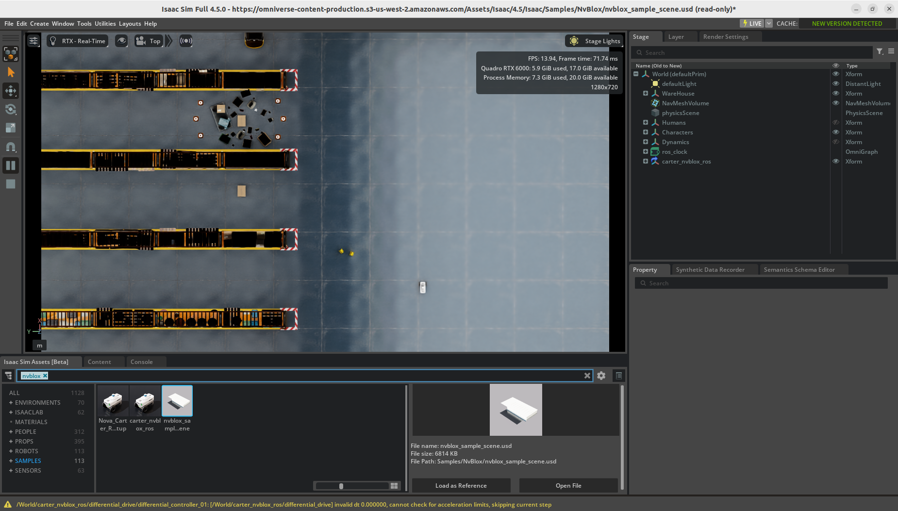 Isaac Sim Assets [Beta] > SAMPLES, search fornvblox_sample_scene.usd, select it and clickOpen File. After the scene loaded, click thePlaybutton to start the simulation. If a warning message appears, clickOKto allow script execution.