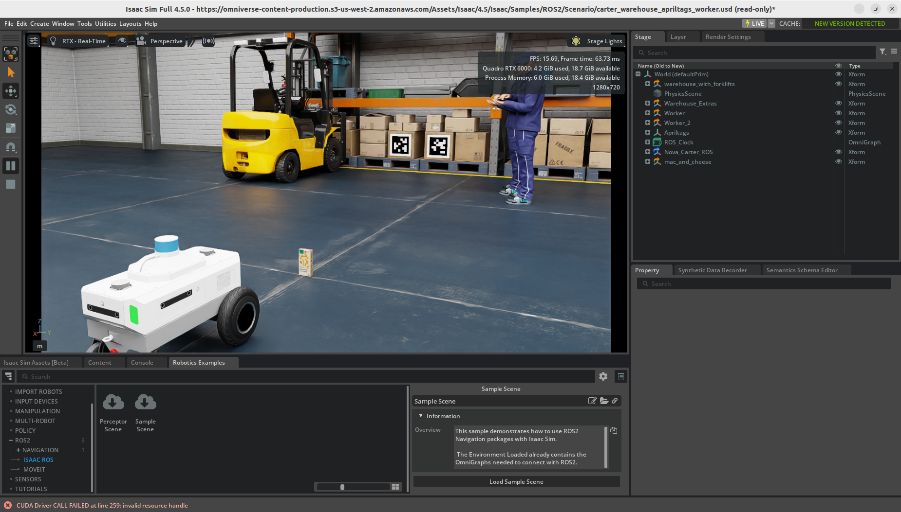 Window > Examples > Robotics Examples. In theRobotics Exampleswindow, selectROS2 > Isaac ROS > Sample Sceneand clickLoad Sample Scene. After the scene loaded, click thePlaybutton to start the simulation.